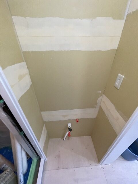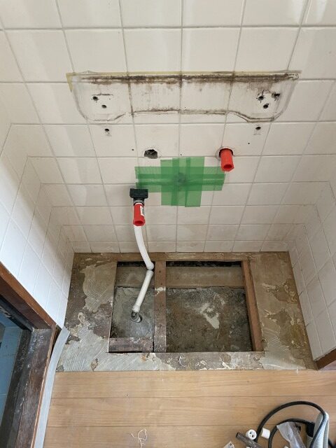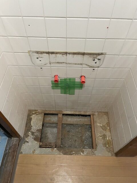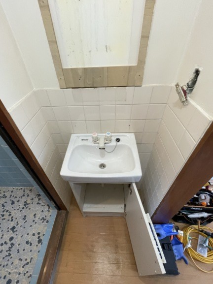 築年数の古いマンションでは給湯配管に「銅管」が使われており、その銅管のエルボ(曲がり部分)から漏水するケースが増えていました。本事例では賃貸マンションの退去後のリフォームに伴い、給湯管を樹脂管に更新し、洗面化粧台も新しく交換することになりました。